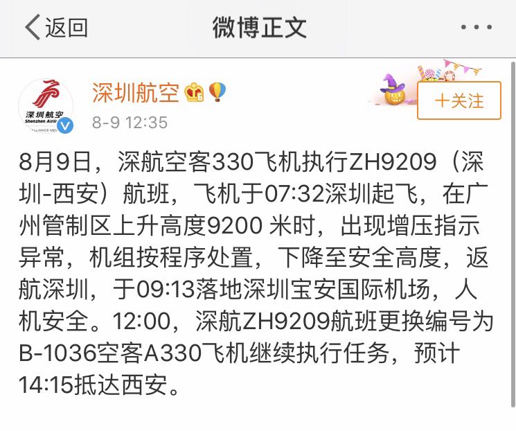 长江网8月9日讯(记者王谦)8月9日12时35分,深圳航空在官微发布声明,深航空客330飞机执行ZH9209(深圳-西安)航班,飞机于07:32深圳起飞,在广州管制区上升高度9200米时,出现增压指示异常,机组按程序处置,下降至安全高度,返航深圳,于09:13落地深圳宝安国际机场,人机安全。