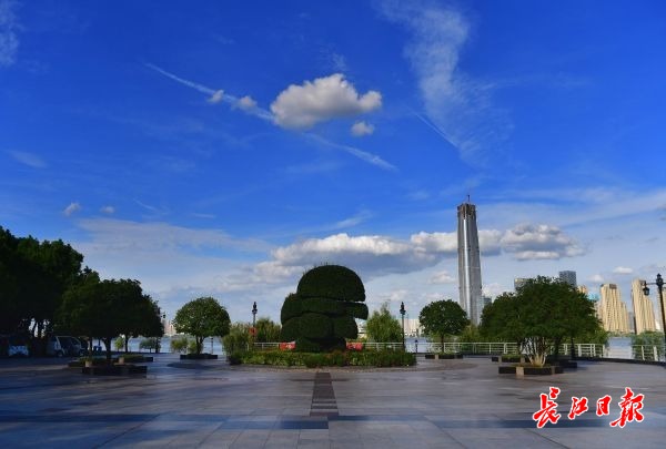 整洁如新的汉口江滩江汉门小广场,徜徉在蓝天白云下。 记者李永刚 摄