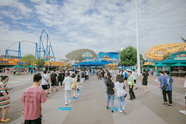 在武汉欢乐谷,预约游客排队入园。 武汉欢乐谷 供图