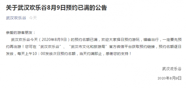 9日9时30分,记者登录武汉市文化和旅游局官方预约通道发现,欢乐谷、武汉海昌极地海洋公园、黄鹤楼等热门景区门票已经约完。