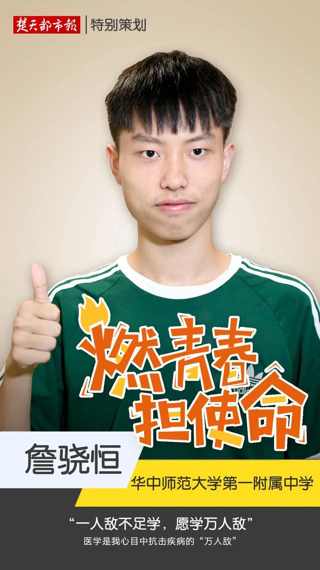 华中师大一附中高三(25)班詹骁恒在今年高考中获得676分,他选择参加强基计划并顺利录取,“这是因为对基础学科的热爱,对北京大学的向往,尤其是从事医学研究将来有机会为社会作点贡献!”詹骁恒说。