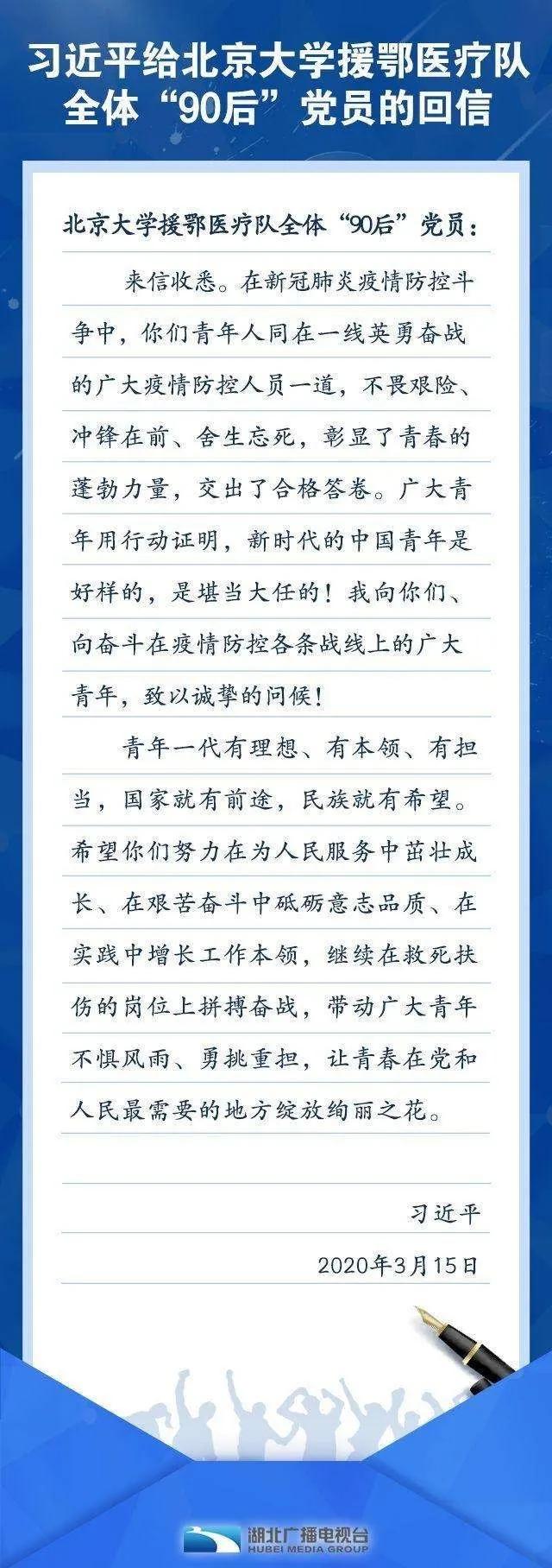 次日,他们代表北京大学援鄂医疗队全体“90后”医务人员,给总书记写了一封信。他们在信中写道:“90后年轻党员和老党员一起,冲锋在前,充分发挥模范带头作用。我们用实际行动证明,我们不是‘娇滴滴的一代’!我们不怕苦、不怕牺牲,争做共和国的脊梁!”