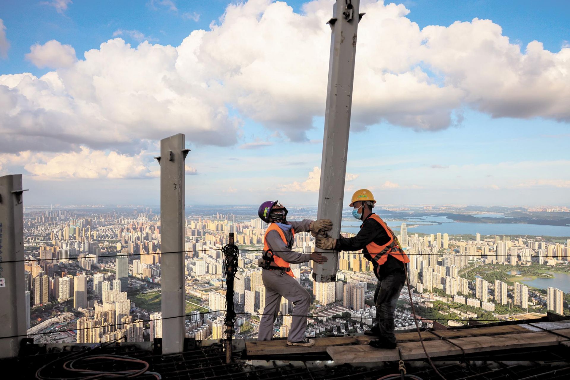 8月6日,武汉绿地中心99层施工平台上,工人冒着高温,在离地面约470米的高处安装构件。武汉绿地中心项目正加紧建设,预计今年底主体结构收尾,外幕墙施工基本完成。 (湖北日报全媒记者 柯皓 摄)