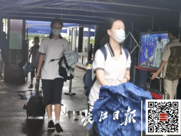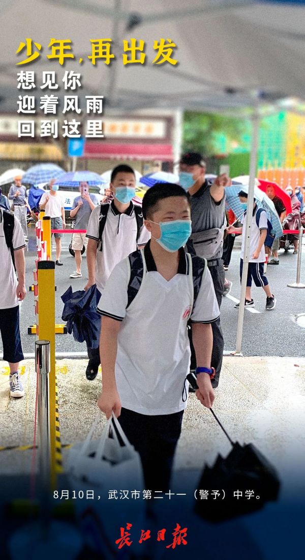 早上7时,雨中,武汉二中广雅中学迎来返校复学的初一、初二学生。