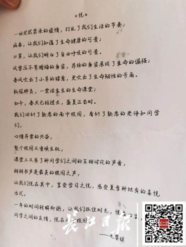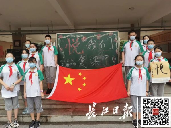 武汉市南湖中学,在复学第一天举行了升旗仪式。学生们手举“悦”字,表达复课复学后的兴奋之情。
