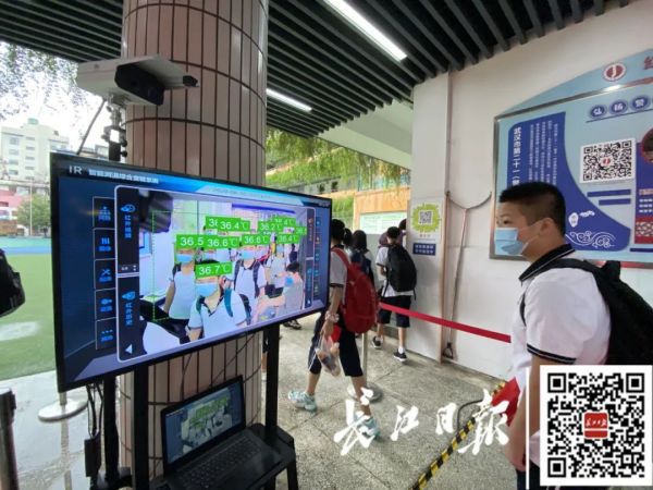 为错峰分流,该校启用两个校门,胜利街、江边校门均配备全自动红外测温设备并设置专用通道,学生们进入校门前自觉间隔排队,测量体温,无发热等症状方可入班。