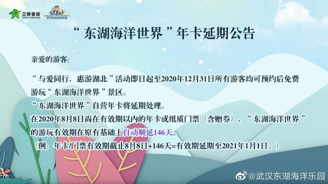 昨天,武汉景区旅游年卡、湖北腾旅科技有限责任公司官微分别发布公告,大武汉旅游年卡、腾旅e卡通旅游年卡于2020年8月8日至12月31日期间处于有效期的,其有效期限顺延146天使用。(详情>>)