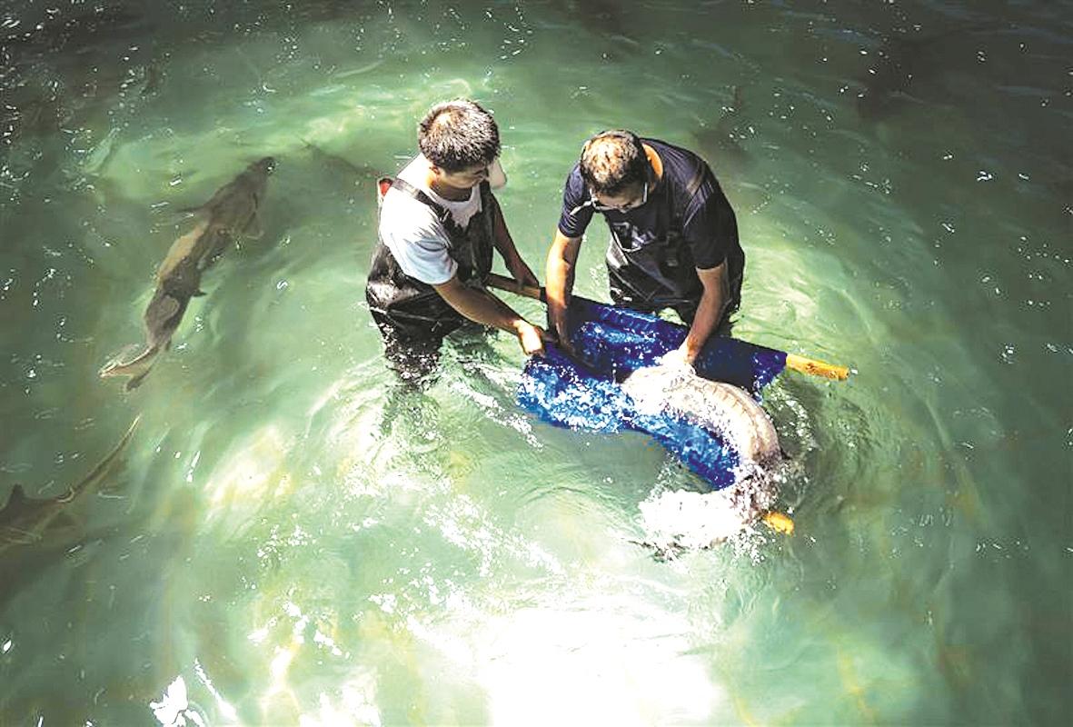 图为工作人员在长江三峡珍稀特有鱼类保育中心检查中华鲟的发育情况。
