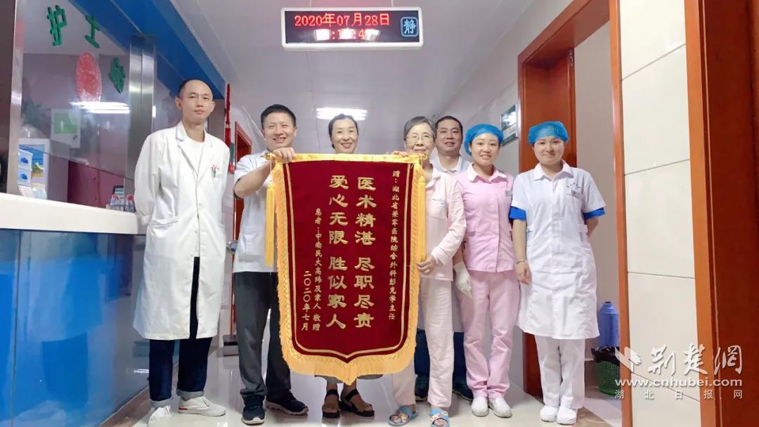 荆楚网客户端—荆楚网消息(通讯员 孙四海)“我年纪大了,而且还有基础病,要上手术台说不怕是假的,但是是彭主任,给了我信心。”近日,湖北省荣军医院治愈出院的患者高奶奶和家属把印有“医术精湛 尽职尽责 爱心无限 胜似家人”字样的锦旗送到外三科医护人员手里,真诚地表达自己的感激之情。