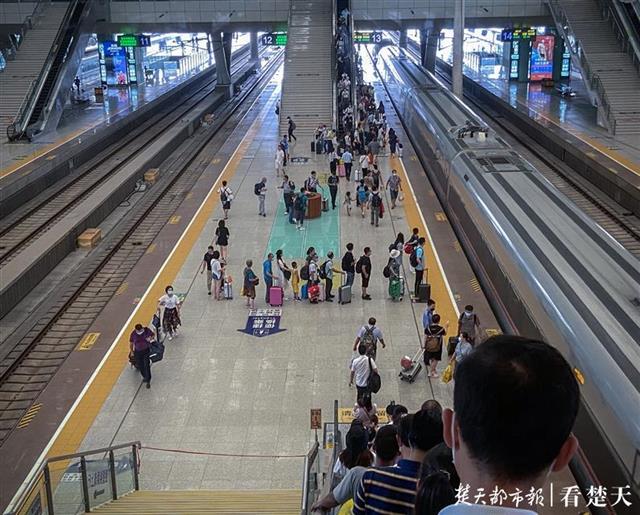记者在武汉火车站候车厅前看到,陆续赶来坐高铁的乘客在黄马夹志愿者的引导下有序进站,大部份乘客是趁周末在武汉旅游后,乘高铁返程。候车厅检票口排起长龙在检票进站台乘车,站台上的乘客也在有序排除等车。