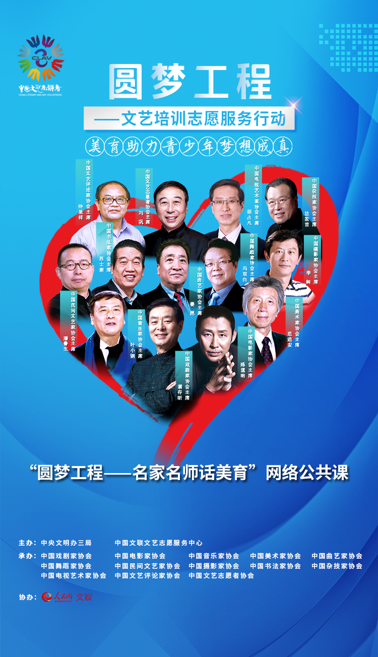 “圆梦工程——名师名家话美育”网络公共课共计13场,将于8月陆续推出。届时,包括中国杂技家协会主席边发吉、中国民间文艺家协会主席潘鲁生、中国摄影家协会主席李舸、中国曲艺家协会副主席叮当、中国书法家协会主席苏士澍、中国电视艺术家协会副主席王丽萍、中国戏剧家协会副主席冯玉萍、中国文艺评论家协会副主席王一川等在内的音乐、美术、书法、舞蹈、电影、戏剧等各领域专家将就自己的专业领域,亲自为网友授课。