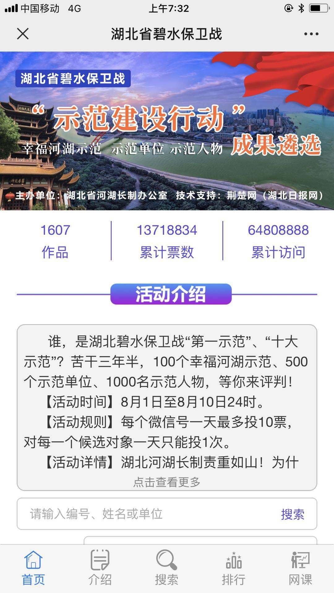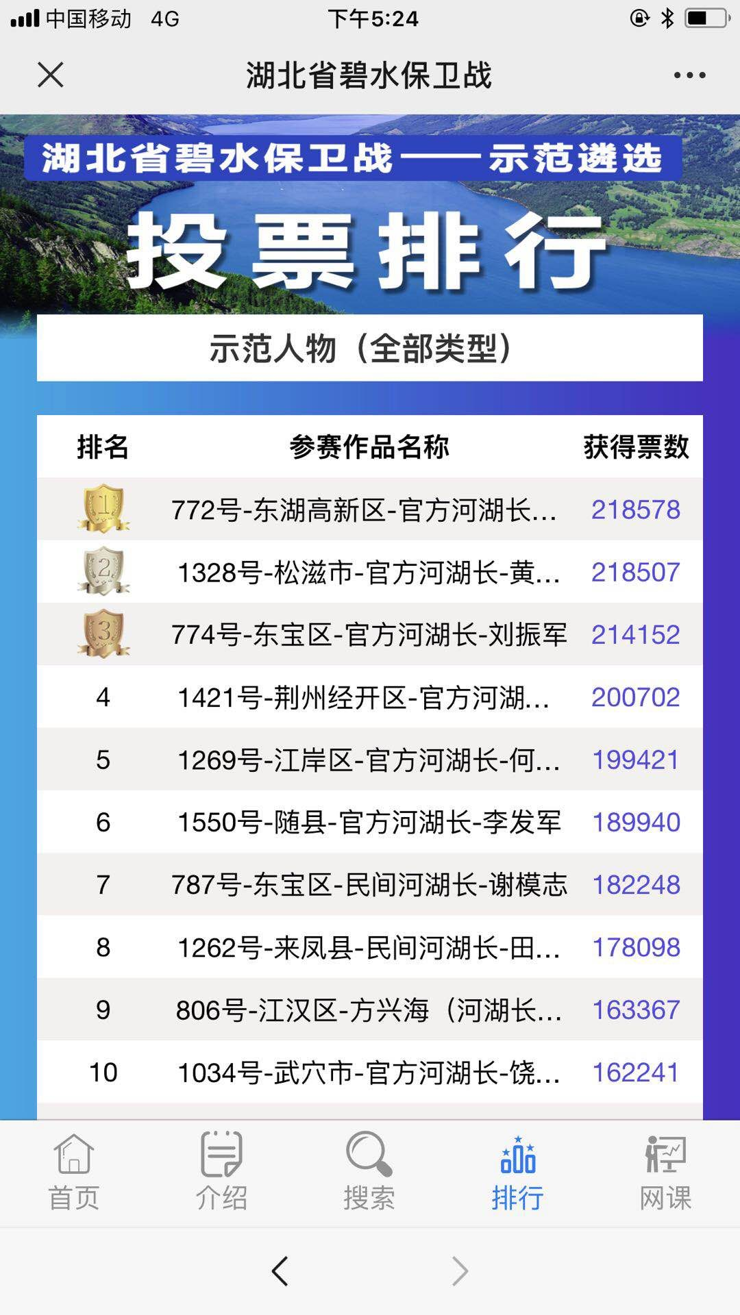 8月10日24时,经过10天的激烈角逐,湖北省碧水保卫战“示范建设行动”成果遴选(幸福河湖示范、示范单位、示范人物)网络投票活动圆满结束、落下帷幕。