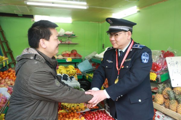 照片中的中年男子名叫王兆阳,今年43岁,是这间“开心水果”店的老板。城管“大盖帽”名叫胡毅峰,是洪山区和平街城管中队的中队长。
