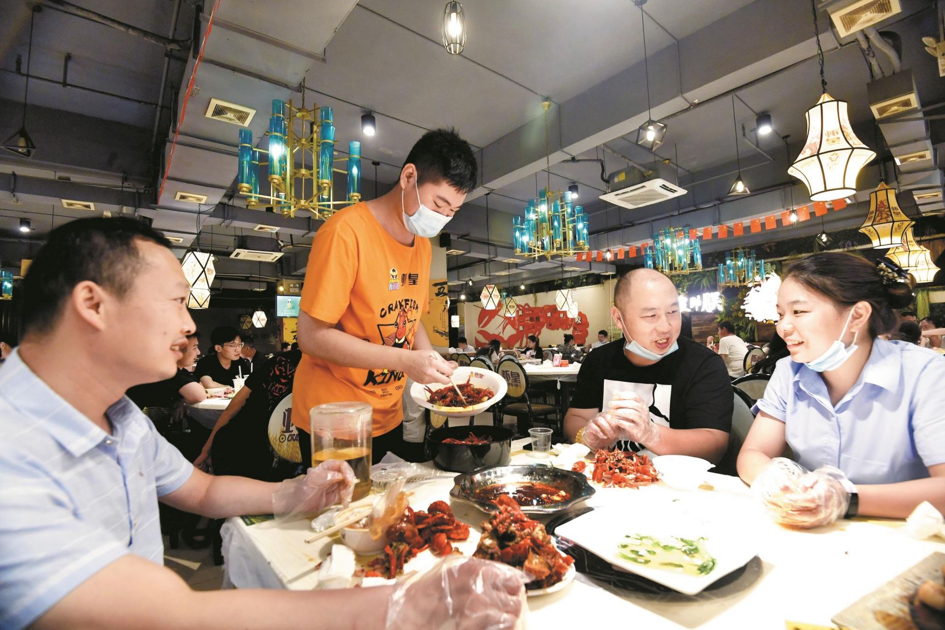 昨晚,洪山区卓刀泉一家虾店,服务员正在将顾客没吃完的虾打包
