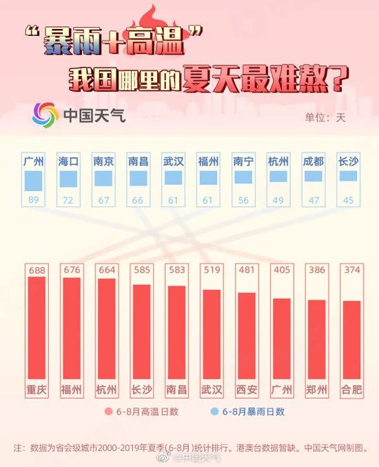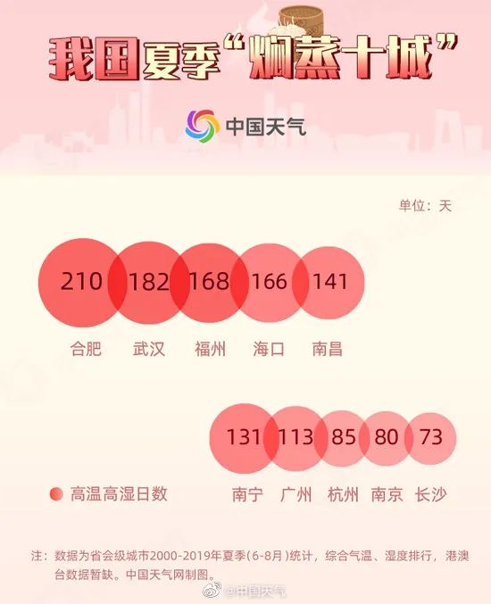 2000年至2019年夏季(6月至8月)统计显示,合肥高温高湿日数达210天,武汉、福州、海口也分别为182天、168天、166天,为我国“焖蒸感”最强的四个省会级城市。