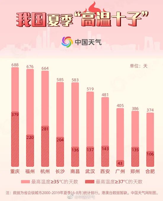 从2000年至2019年夏季省会级城市的高温日数来看,南方的高温日数明显多于北方,前10位中,北方仅有西安、郑州这两个代表城市,南方城市上榜的则有重庆、福州、杭州、长沙、南昌、武汉、广州、合肥这八个城市。其中,热得比较“突出”的要数重庆、福州、杭州、长沙,为当之无愧的“炎热四杰”。