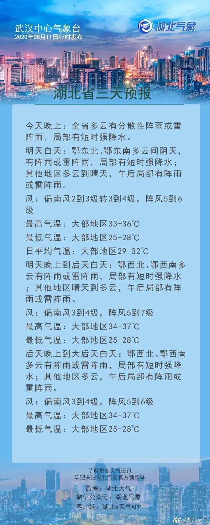 明天晚上到后天白天:鄂西北、鄂西南多云有阵雨或雷阵雨,局部有短时强降水;其他地区多云,午后局部有阵雨或雷阵雨。