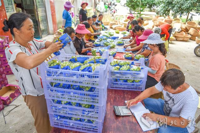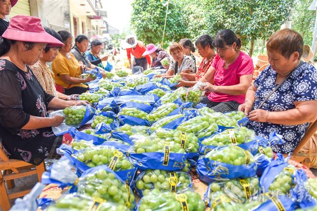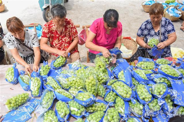 8月11日,在荆州市荆州区弥市镇刘家桥村的葡萄种植合作社,村里的留守妇女对采摘的葡萄进行分拣打包。近年来,在产业扶贫过程中,荆州区弥市镇因地制宜,大力发展果蔬种植产业,通过制定各项配套政策,引进农业龙头企业,发展培育了一大批果蔬种植专业合作社,在带动农民脱贫增收的同时,也为全镇212名留守在家的妇女提供了就业岗位。(视界网 黄志刚 摄)