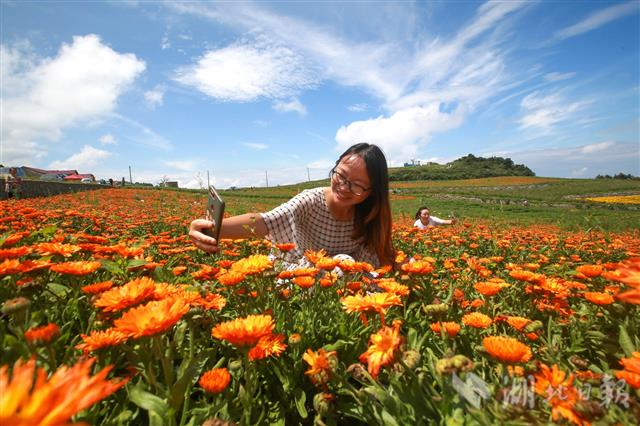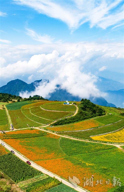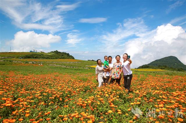 8月12日,游客在秭归县郭家坝镇白云山村大金坪花海休闲游览,乐享暑期美好时光。