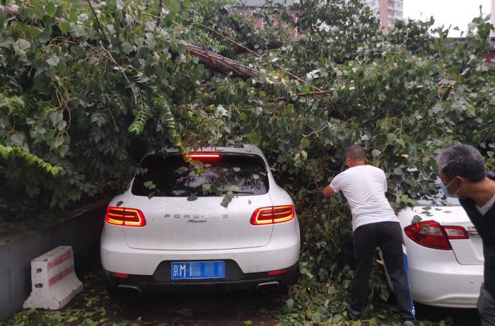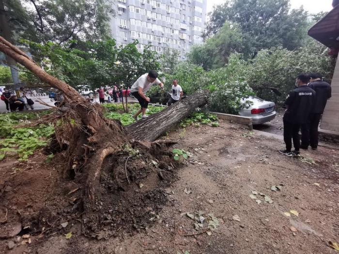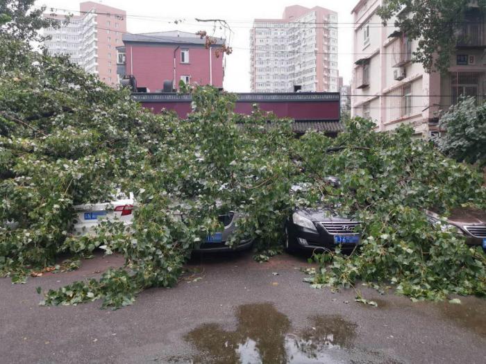 8月12日14时30分左右,北京三里屯南路西侧,一棵20余米的大杨树连根拔起砸在了停在路边的七辆轿车上。当天,北京市发布了雷电黄色预警。(来源:北京头条客户端)