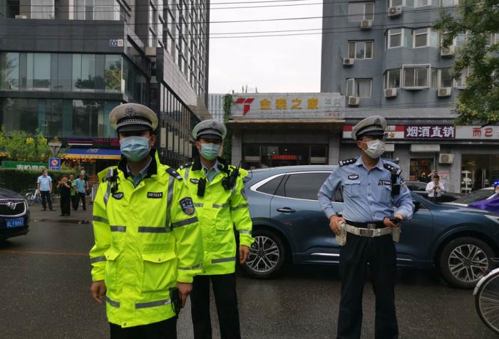 8月12日,三里屯南路,民警来到树倒砸车的现场执勤。