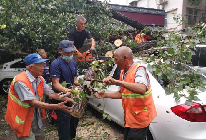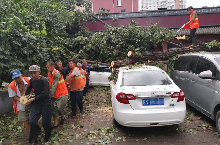 朝阳园林局的工人们接报赶来,对现场进行清理,将倾倒的大树逐段肢解。