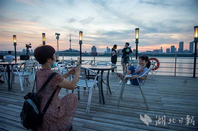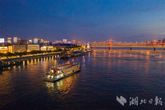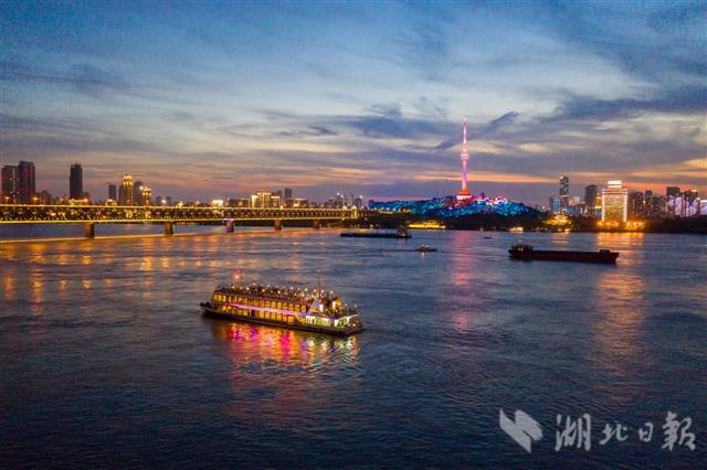 2020年8月12日傍晚,“黄鹤楼号”游船在长江武汉段航行。当日,因长江汛情停航的武汉两江游览游船复航。连日来,长江水位持续下降,两江游览游船达到复航条件。为了迎接再次复航,工作人员对游船进行了彻底消毒,全方位保障游客安全。(湖北日报全媒记者 蔡俊 摄)