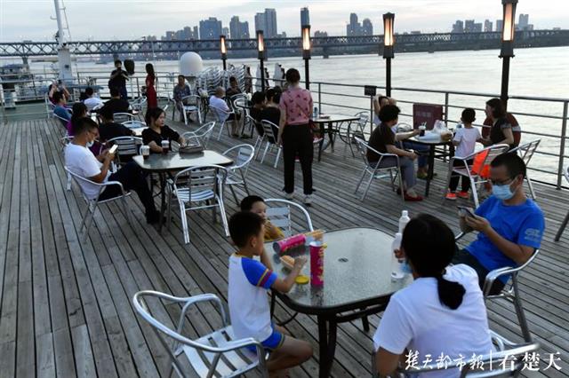 游客李先生泛舟长江,吹着江风,赏着江景,非常惬意,不禁感叹:“武汉是一座英雄的城市,经历疫情和洪水,繁华的大武汉又回来了!”