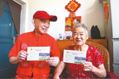 张振文(左)和老伴陈爱媛出示各自的遗体捐献登记表。