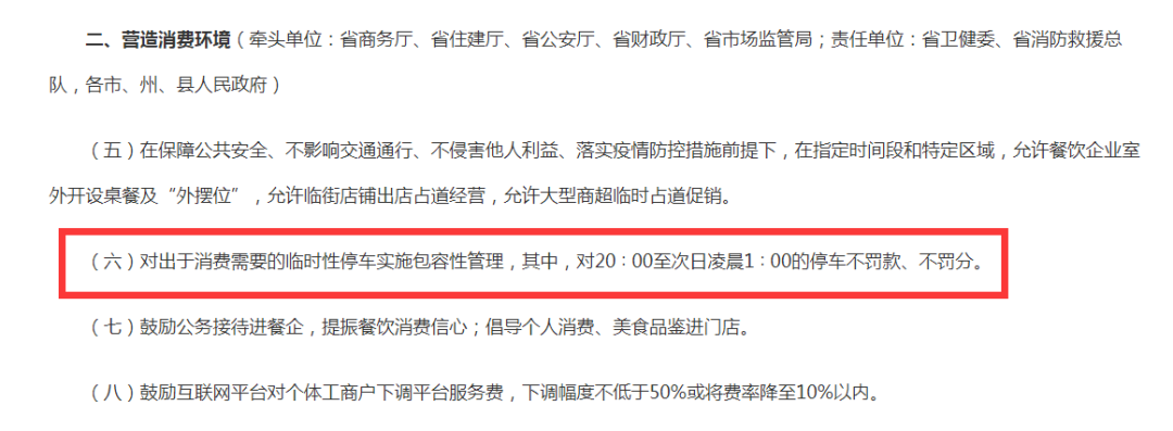 洪山交通大队回应称,该队目前积极响应《湖北省人民政府办公厅关于印发应对疫情影响进一步促进商业消费若干措施的通知》第六条的规定:对出于消费需要的临时性停车实施包容性管理,其中,对20:00至次日凌晨1:00间的停车不罚款,不罚分。