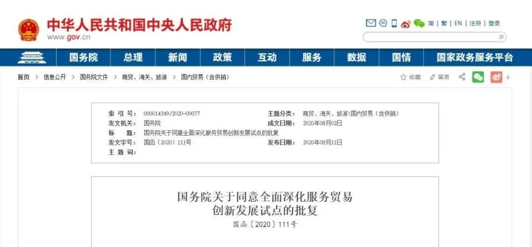 《国务院关于同意全面深化服务贸易创新发展试点的批复》发布,原则同意商务部提出的《全面深化服务贸易创新发展试点总体方案》,同意在北京、天津、上海、重庆(涪陵区等21个市辖区)、海南、大连、厦门、青岛、深圳、石家庄、长春、哈尔滨、南京、苏州、杭州、合肥、济南、威海、武汉、广州、成都、贵阳、昆明、西安、乌鲁木齐和河北雄安新区、贵州贵安新区、陕西西咸新区等28个省、市(区域)全面深化服务贸易创新发展试点。全面深化试点期限为3年,自批复之日起算。