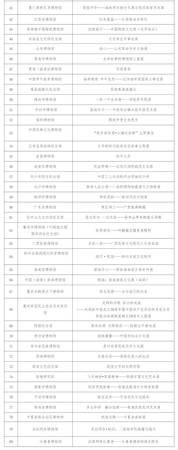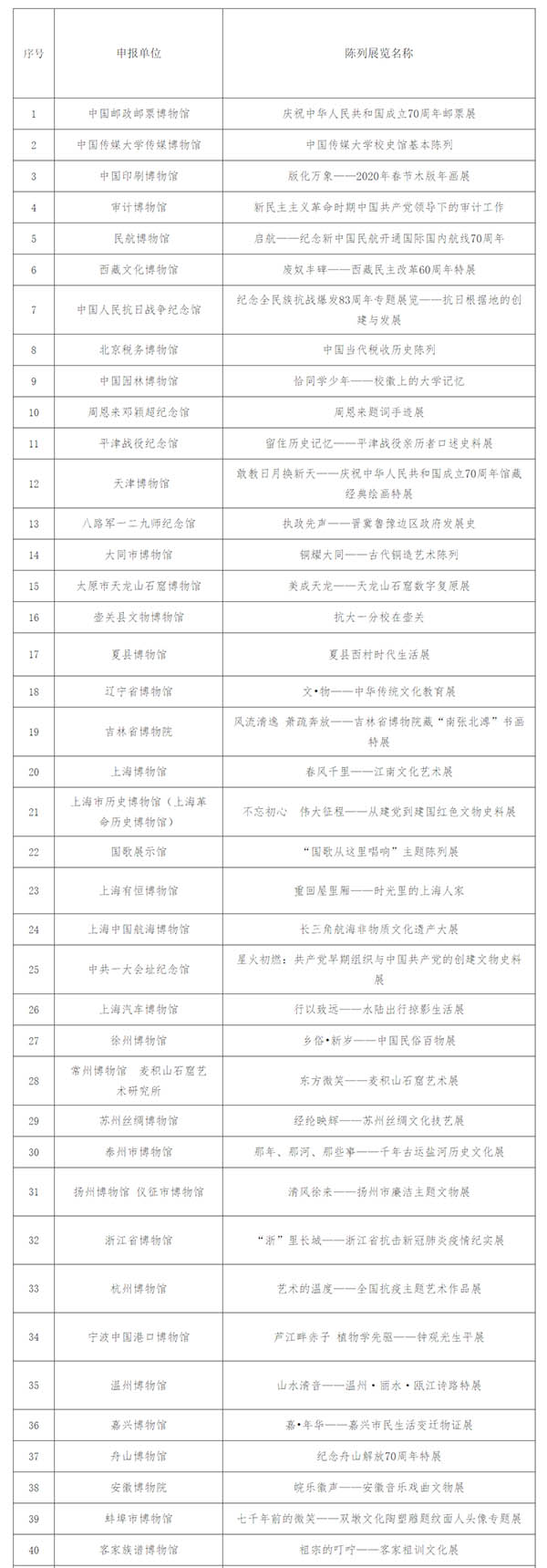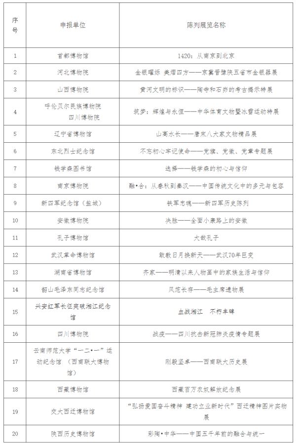 人民网北京8月13日电 近日,国家文物局向社会推介100项2020年度“弘扬优秀传统文化、培育社会主义核心价值观”主题展览,其中重点推介展览20项(名单附后)。