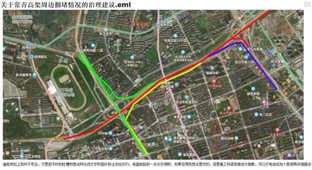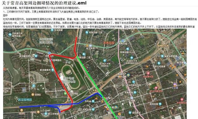 楚天都市报8月13日讯(记者吴昌华 通讯员李佳 武邦杰)“从我的角度看,每天早晨常青高架的拥堵是由几个完全没有联系的问题组成的……”一位普通市民发给武汉交警的电子邮件提出自己的分析、建议,并附上绕行建议图。记者获悉,自8月10日武汉交警邀请市民为缓解常青高架拥堵建言献策,截至今日已收到近百条意见和建议,不少热心市民画出了优化交通组织建议图,其中呼声最高的集中在3个方面,即减少交通流交织、利用周边道路分担交通压力以及提升文明行车习惯。