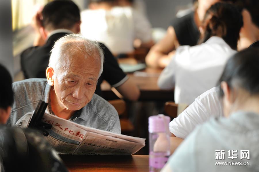 8月13日,一位75岁的读者在舒城县图书馆阅读报刊。新华社记者陶明摄