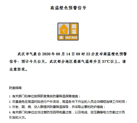 长江网8月14日讯(见习记者范佳昕)8月14日9时22分,高温预警信号再次升级为橙色:预计今天白天,武汉部分地区最高气温将升至37℃以上,请注意防范。