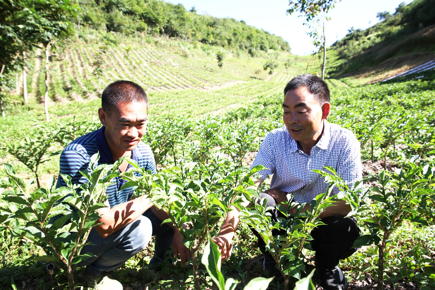 8月12日,巴东县水布垭镇许家湾村,巴东县三杨树坡生态农业专业合作社负责人陈兹民(右)在魔芋地里向农户介绍花魔芋的生长特性。他尝试在荒地上成片种植花魔芋获得成功并成立了专业合作社,带动村民致富。(农村新报通讯员 陈祥楚 摄)