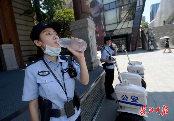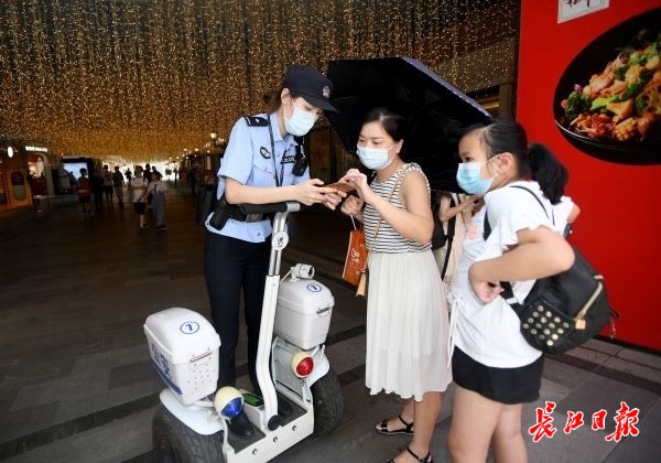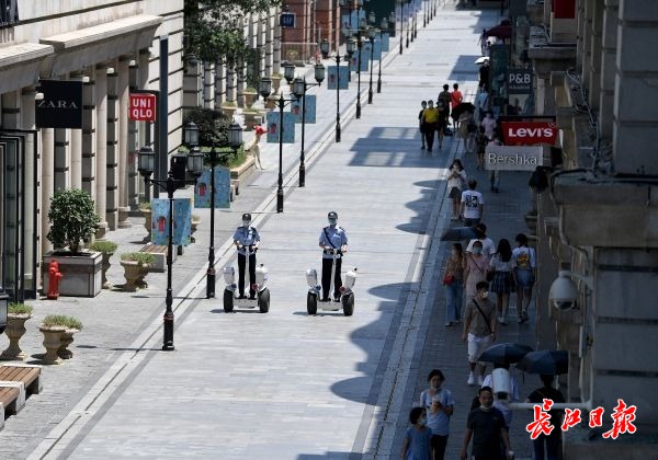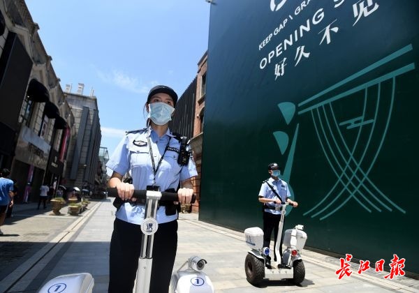 长江日报-长江网8月14日讯 8月13日,在武汉市楚河汉街,武汉市公安局武昌区分局汉街派出所民警顶着烈日,骑着电动平衡车往返巡逻。民警王晨昕介绍,随着近期汉街游客人数逐渐增多,他们加大巡逻力度,守护游客平安。(记者史伟 通讯员应后威 孙逊 摄影报道)