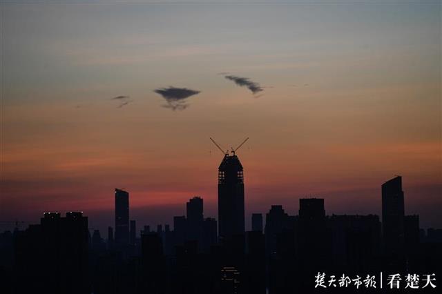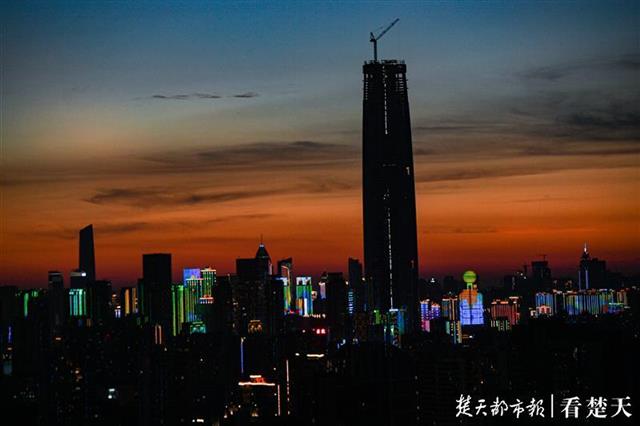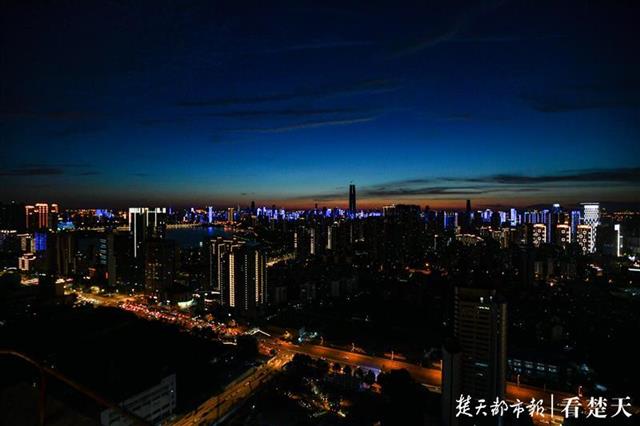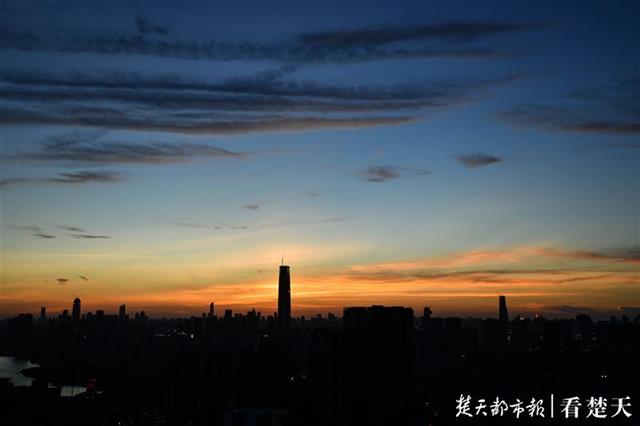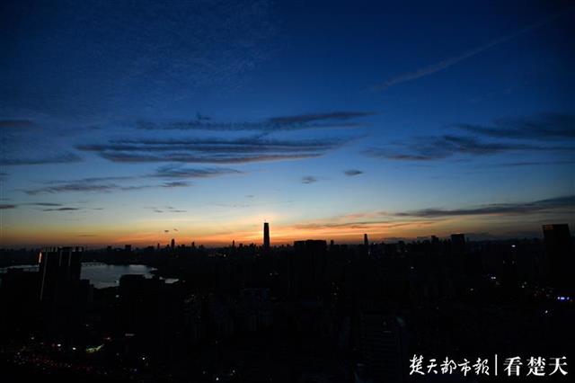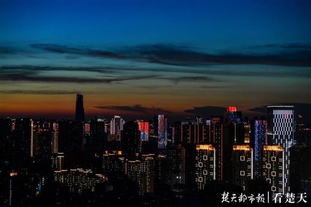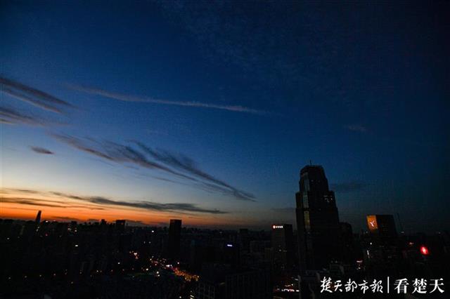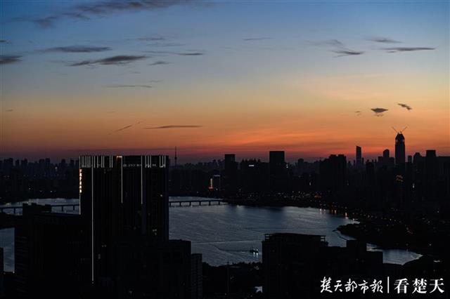 8月14日傍晚,楚天都市报记者在武昌中北路楚天都市雅园楼顶看到,落日西下,金色的霞光洒满天空。随后鳞次栉比的高楼彩灯亮起,将人的视线从天空移向大地。美丽江城的夜晚拉开序幕。(楚天都市报记者 王永胜摄)