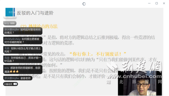 荆楚网客户端—荆楚网消息(记者叶辉 通讯员毛薇)8月14日晚,由湖北省图书馆、省演讲协会、楚商联合会共同举办的e海悦读“知识为舟,共渡时艰”2020湖北首届企业辩论大赛第二期培训,在CCtalk湖北省图书馆阅读直播间线上开讲。超级辩手上道导师团签约导师、曾任华中师范大学校辩论队队长、结芦演讲与辩论协会教练的杨成轩老师奉上《反驳的入门与进阶》,助力选手们在辩论开杠中克敌制胜。