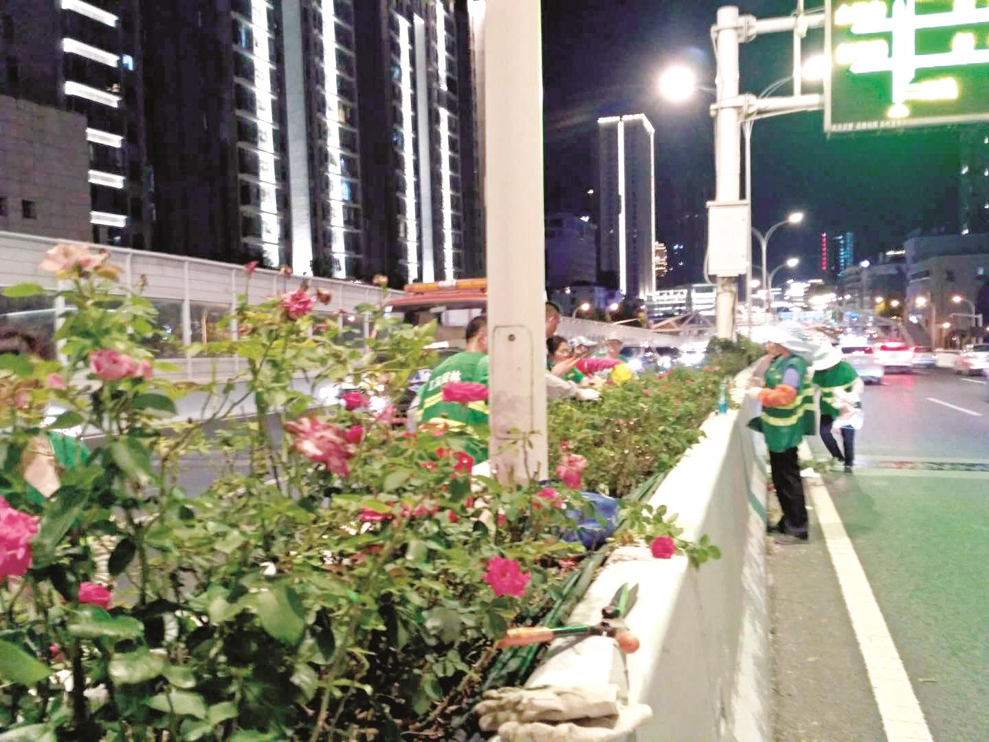 这几天深夜,江城二环线中分带仍有园林工人忙碌的身影。他们手持剪刀修剪月季,只为一个多月后的国庆期间,武汉百万株月季一同绽放。