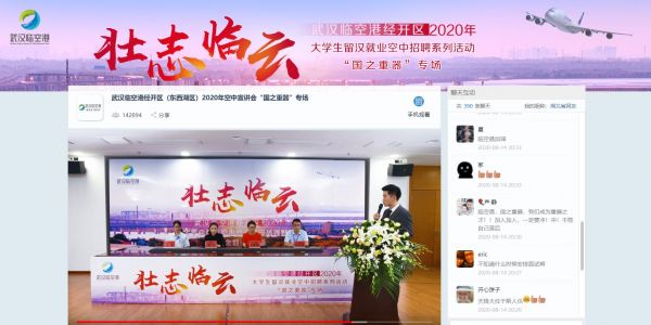 “岗位对学历的要求是什么?”“请问企业文化是怎样的?”活动还没正式开始,就有网友在评论区中频频提问。岗位需求、企业文化和薪酬待遇等问题,是毕业生们普遍较关注的问题。 在专场招聘会中,武汉航达航空科技发展有限公司、京东方科技集团股份有限公司等8家区内名企的招聘负责人一同亮相,除推介企业外,也对毕业生关心的问题一一回复。