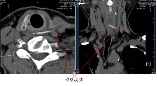 食道CT显示,鱼刺尖端紧邻左侧颈总动脉。