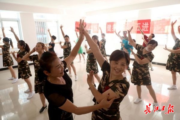 长江网记者了解到,参加本次广场舞培训的学员,有不少是天兴乡安置点的村民。由于长江水位持续上涨,7月11日天兴洲主动扒口行洪,洲上的部分居民集中转移到了和平街街道口小学东方雅园分校的临时安置点。