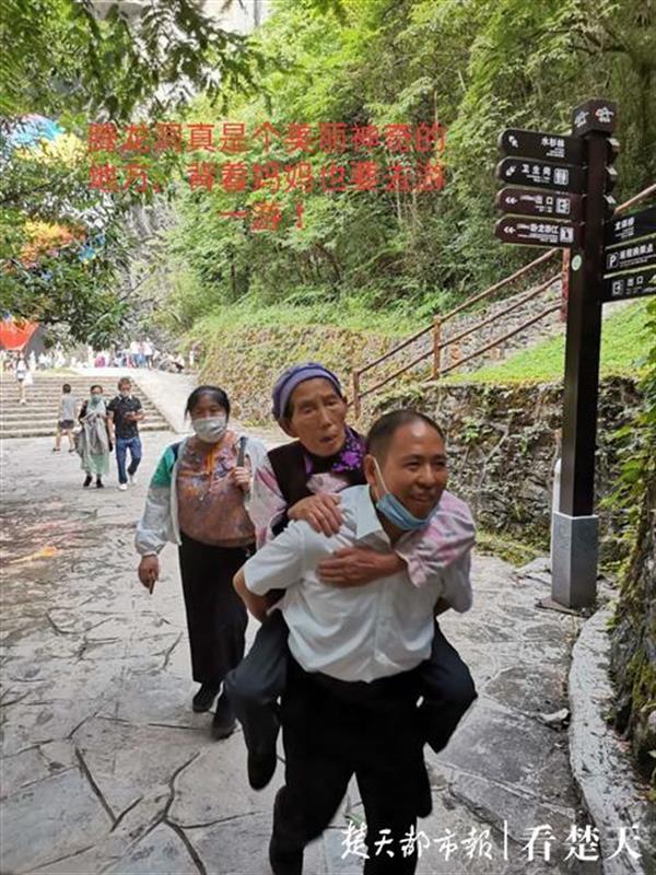 张林超听说景区免门票,心中十分欢喜,便决定带着母亲看她从来没有看过的腾龙洞,让刚刚出院的母亲散散心。但母亲大病初愈,行动不便。张先生便决定,像小时候母亲背着自己去劳动一样,背着母亲去看腾龙洞。