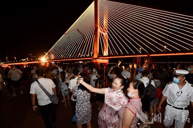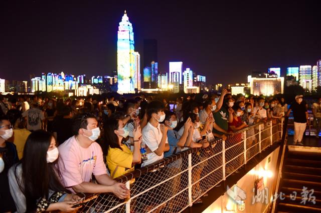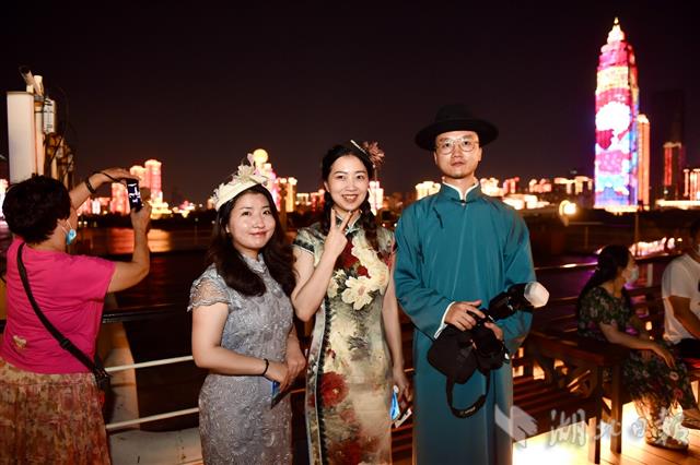继两江游览游船8月12日晚复航之后,驻泊在汉口江滩、因汛期休演的《知音号》也于8月15日晚正式“复出”,与广大观众再度见面。“知音号”因汛情休演40天,复航首日游客热情不减,总接待量达到防控要求的观演人数最高限额,再现火爆场景。图为从上海、北京来汉出差的三名游客在知音号顶层甲板饱览长江两岸夜景。(湖北日报全媒记者 李溪 摄)