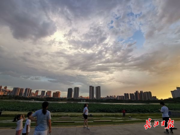 在汉口菱角,突然刮起的凉风迅速驱散了白天的闷热,让人感到格外舒爽,人们走在街头和湖边,感觉格外惬意。