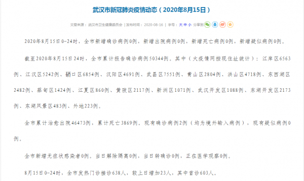 截至2020年8月15日24时,全市累计报告确诊病例50344例。其中(大疫情网按现住址统计):江岸区6563例、江汉区5242例、硚口区6854例、汉阳区4691例、武昌区7551例、青山区2804例、洪山区4718例、东西湖区2482例、蔡甸区1424例、江夏区860例、黄陂区2117例、新洲区1071例、武汉开发区1088例、东湖开发区2173例、东湖风景区483例、外地223例。