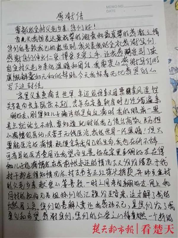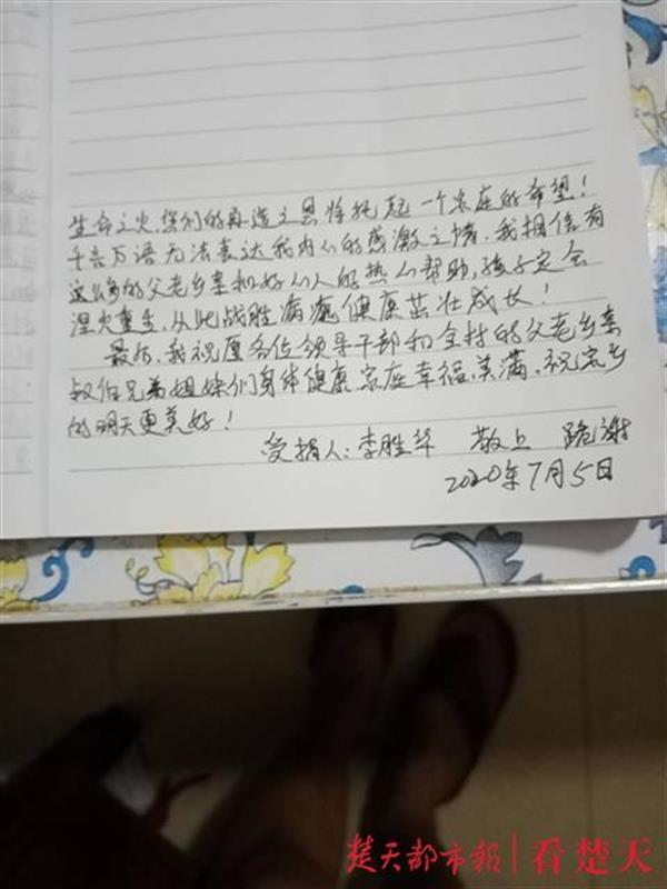 目前,李胜华的儿子还在继续化疗,等待3个月后进行骨髓移植。他手写了一份感谢信,向好心人致谢。他的感激之情正如信中所写:你们给了我勇气和希望,感谢你们的仁爱之心,将重燃一个家庭的生命之火!