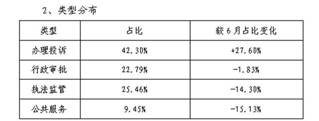 从7月不满意评价类型分布来看,对办理投诉不满意评价数量占比呈上升趋势,占比达到42.30%;对公共服务、执法监管、行政审批不满意评价数量占比均呈下降趋势。