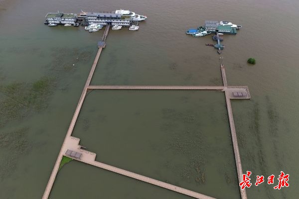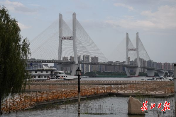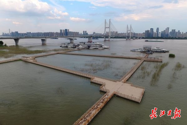 长江网8月17日讯8月17日,长江日报-长江网记者在汉口江滩看到,因为长江涨水而被淹没的观芦栈桥已经显露出来,橘红色的桥身因为江水浸泡裹上一层泥沙变成了黄灰色,目前汉口江滩已经全面开放,等长江水位进一步回落,观芦栈桥也将清洗后对游客开放。(记者詹松 摄影报道)
